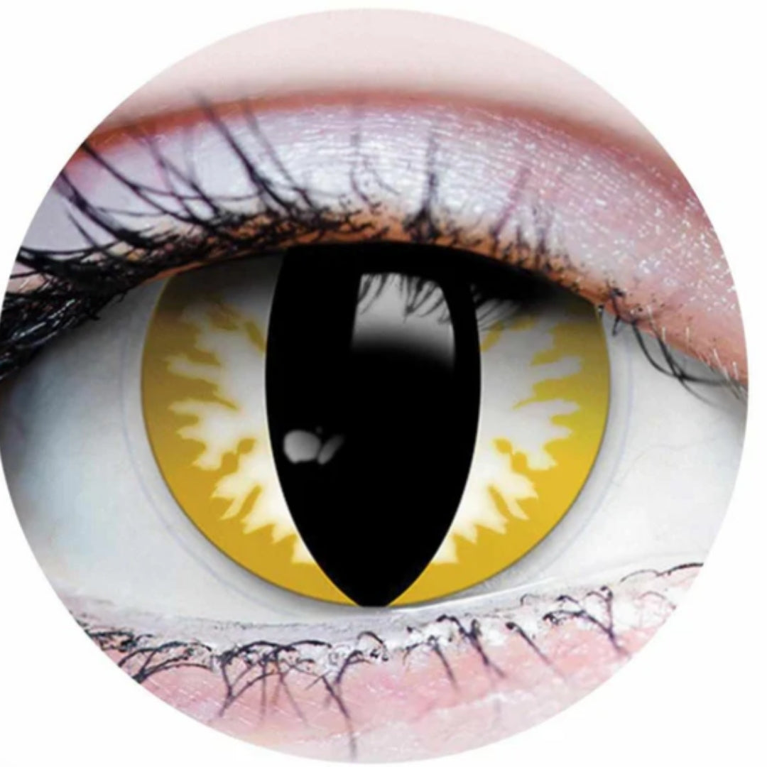 THRILLER features a black slit pupil effect down the center of the lens. Yellow and white opaque sides with a transparent pupil allows for easy vision. Cosplay as your favourite demon from hell or creature of the night.