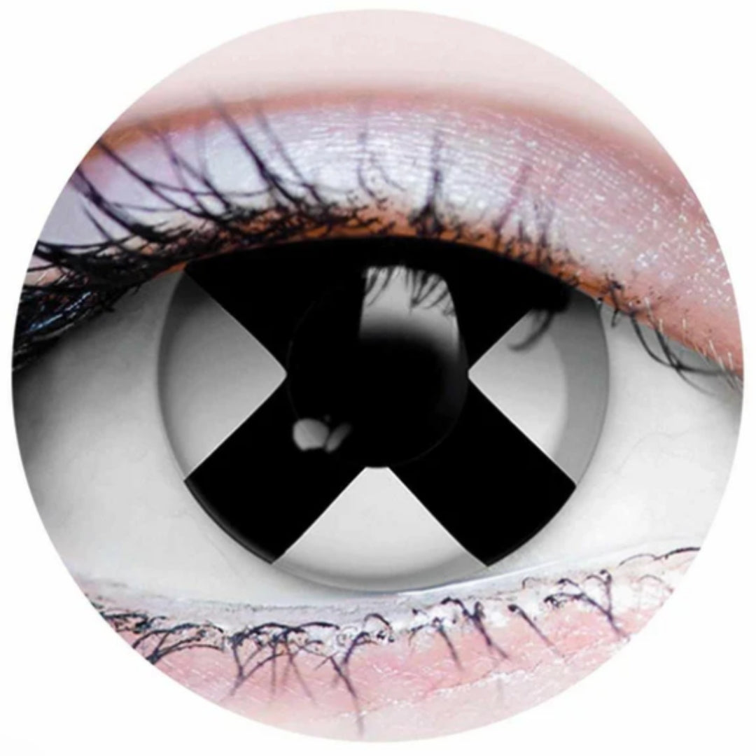 DEADMAN contact lense design features an opaque white base and a "X" from edge to edge through the transparent pupil.