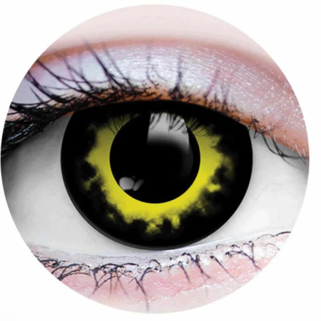 STORM contact lens design features a wide opaque black rim and bright yellow halo around the pupil.