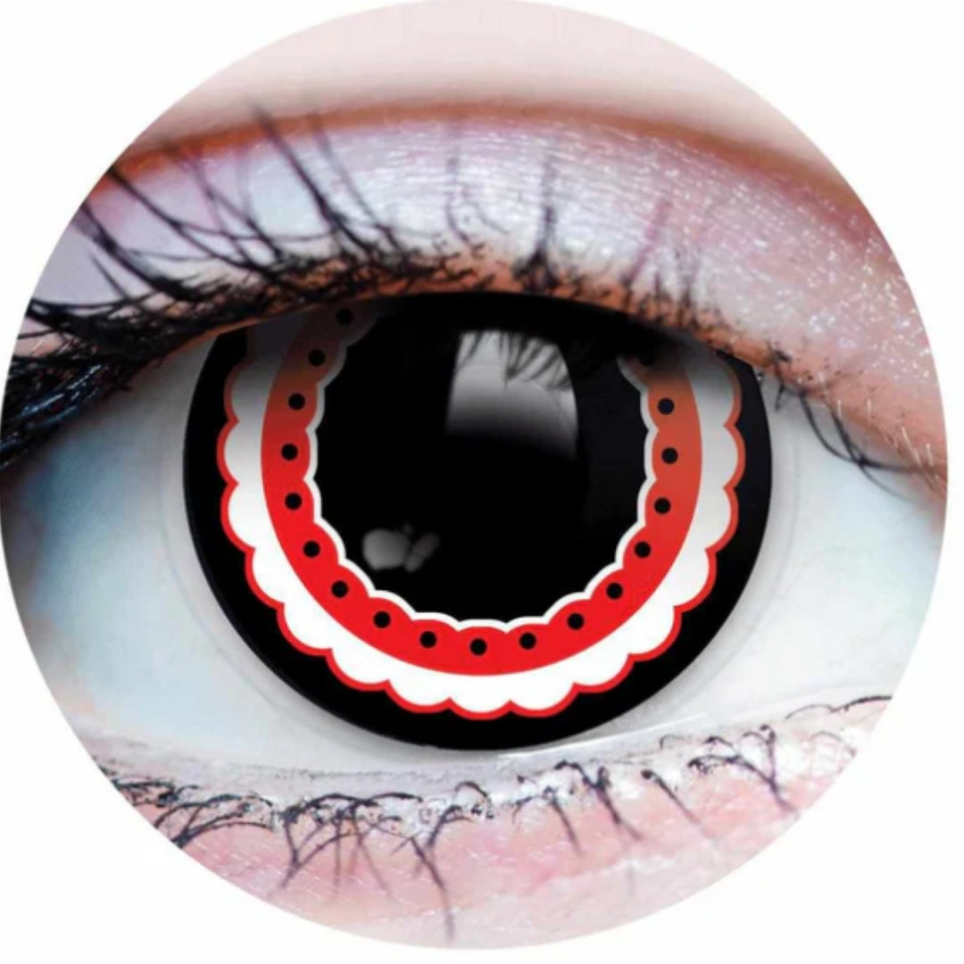 DAY OF THE DEAD contact lens design features circular pattern layers of red, white and black.