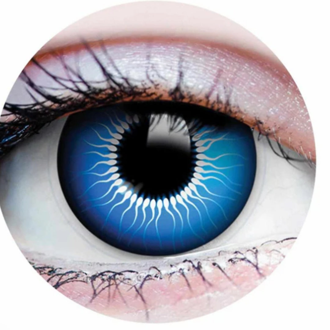 CHUCKY Halloween contact lenses feature a glowing white rim at the center of the lens, surrounded by a dark yet illuminated blue iris.