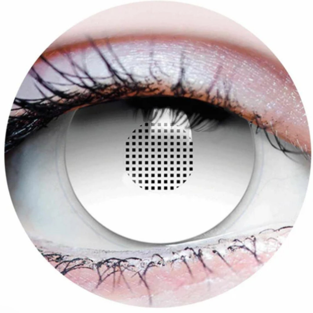 SUB ZERO features an opaque white iris and fine mesh over pupils which allows for vision with complete whiteout. Full eye coverage with comfort and easy to apply. Great for cosplaying a blind character.