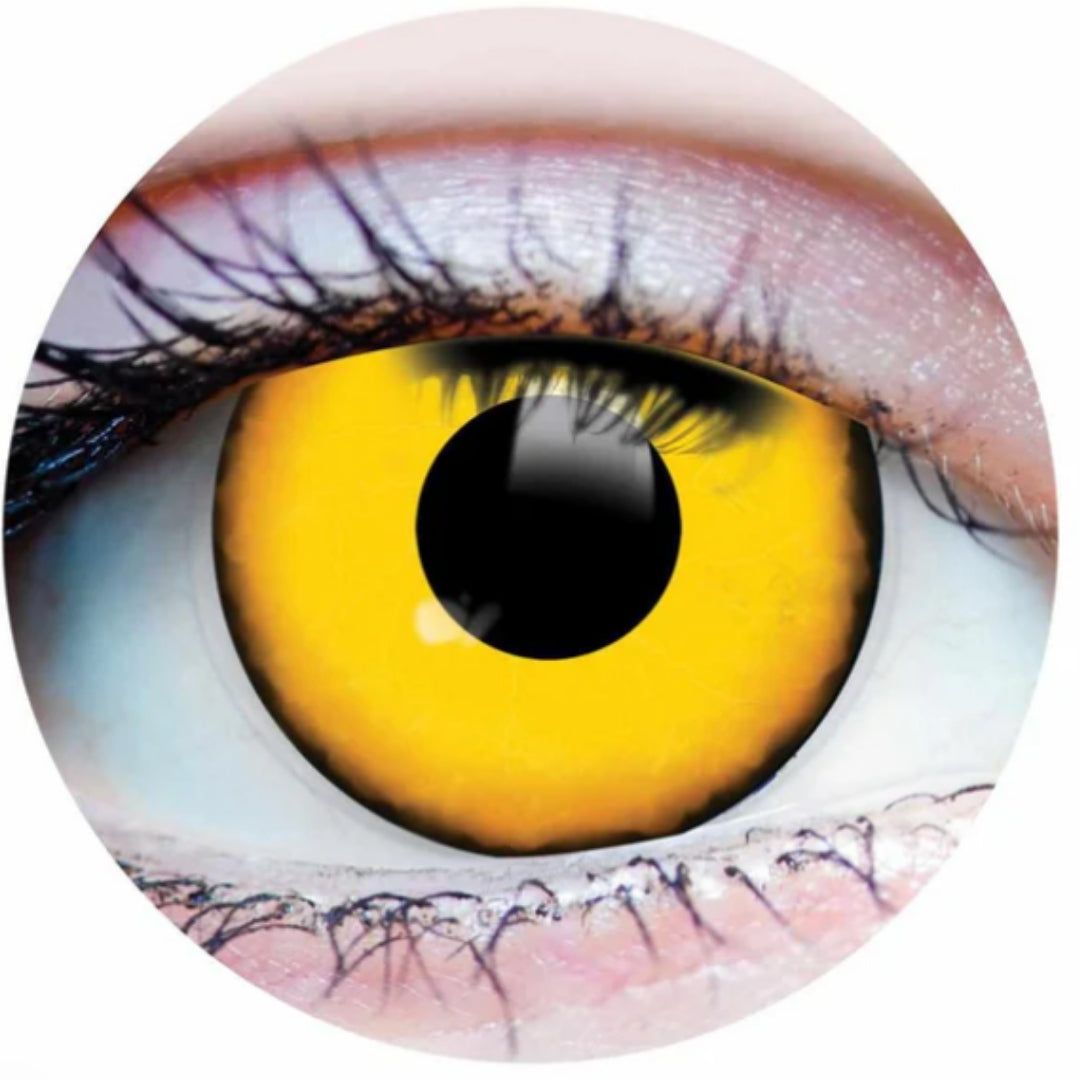 VILLAIN contact lenses features a very opaque gradient of bright yellow at the center that blends in with an orange hue and dark ring at the edge of the lens.