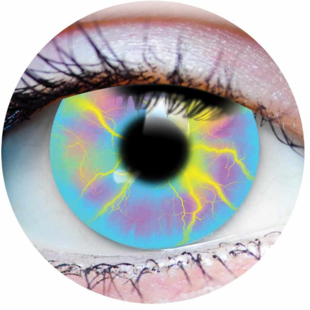 UNICORN contact lens design features a pastel rainbow of lilac and pink with a bright yellow lightning effect on a bright baby blue background. A bright blue ring contours the pupil. Easy to see and comfortable. Perfect for embodying mythical creatures like UNICORNS!
